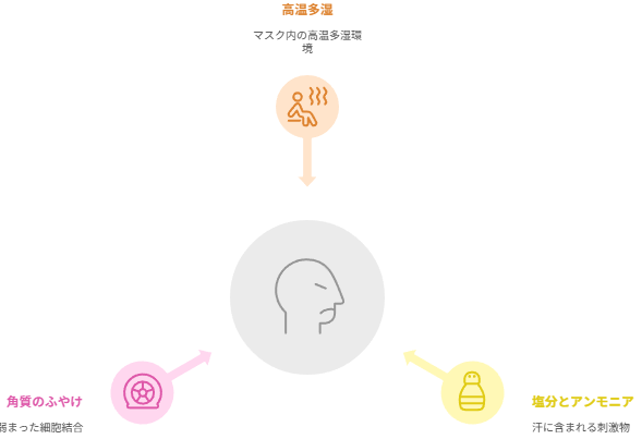マスクの中は呼吸や汗で高温多湿になりやすく、アクネ菌などの菌が増えやすい環境になります。汗に含まれる塩分やアンモニアも刺激となり、赤みやかゆみを引き起こします。