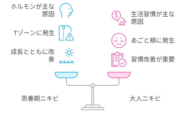 大人ニキビは不規則な生活や乾燥、ストレスなど複数の要因が絡み合い、あごや頬に出やすいのが特徴です。思春期ニキビは成長とともに落ち着く場合が多い一方で、大人ニキビは生活習慣の改善が重要です。思春期のうちから正しいケアを身につけることは、大人ニキビの予防にもつながります。